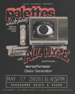 Palettes Album Release tour for White.(Noise) stopping by Programme with our old friends All Hype. They're rocking and rolling with worseforwear and Glass Generation on this date and we're stoked to be packing it out with them. No Drugs. No Booze. No Bullshit. ALL AGES.